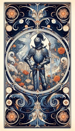 Auf der Karte sieht man typischerweise einen Ritter in voller Rüstung, der auf einem Pferd reitet. In seiner Hand hält er ein Schwert, das aufrecht in den Himmel zeigt, als Zeichen für Klarheit und das Streben nach höheren Zielen. Der Himmel im Hintergrund kann stürmisch wirken, was darauf hinweist, dass der Ritter sich auch in schwierigen Zeiten durchkämpfen muss.